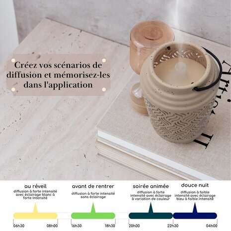 Het begin en einde van de diffusie en de verlichting, de duur van de diffusie en de verlichting, evenals de intensiteit en de kleur van de verlichting, kunnen op afstand worden geprogrammeerd en bediend via een app op uw smartphone of tablet.