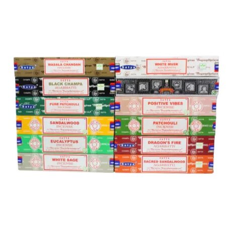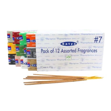 Deze satya assorti mix wierook nm 7 is een doos met 12 verschillende geuren, leuk om cadeau te geven of om eens nieuwe geuren uit te proberen